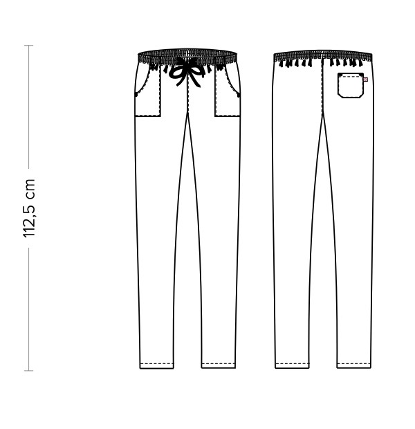 Kangas on antibakteriaalne, säilitab suurepärase hingavuse, pestav kõrgel temperatuuril. Kuivab kiiresti, ei vaja triikimist. Pükstel on kaks taskut külgedel ning üks tagatasku, kummivöö, mis on paelaga reguleeritav.